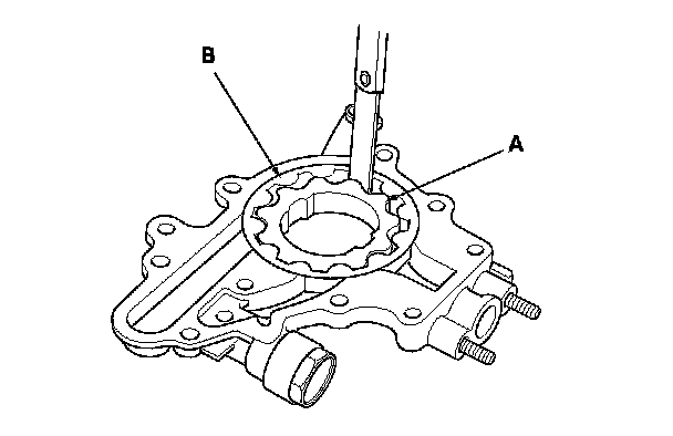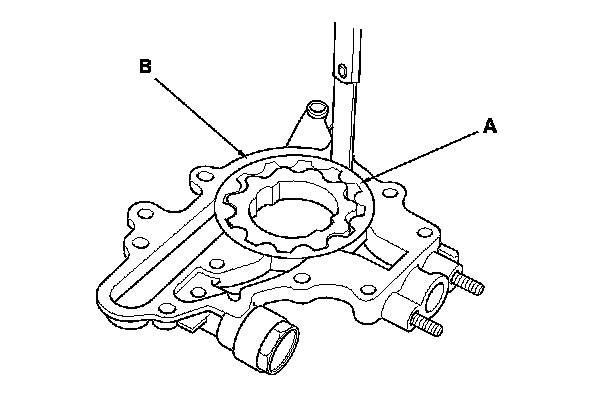 4. Check the pump housing-to-outer rotor radial clearance between the outer rotor (A) and the pump housing (B). If the pump housing-to-outer rotor radial clearance exceeds the service limit, replace the oil pump assembly.