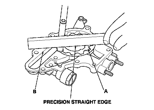 3. Check the pump housing-to-rotor axial clearance between the rotors (A) and pump housing (B). If the pump housing-to-rotor axial clearance exceeds the service limit, replace the oil pump assembly.