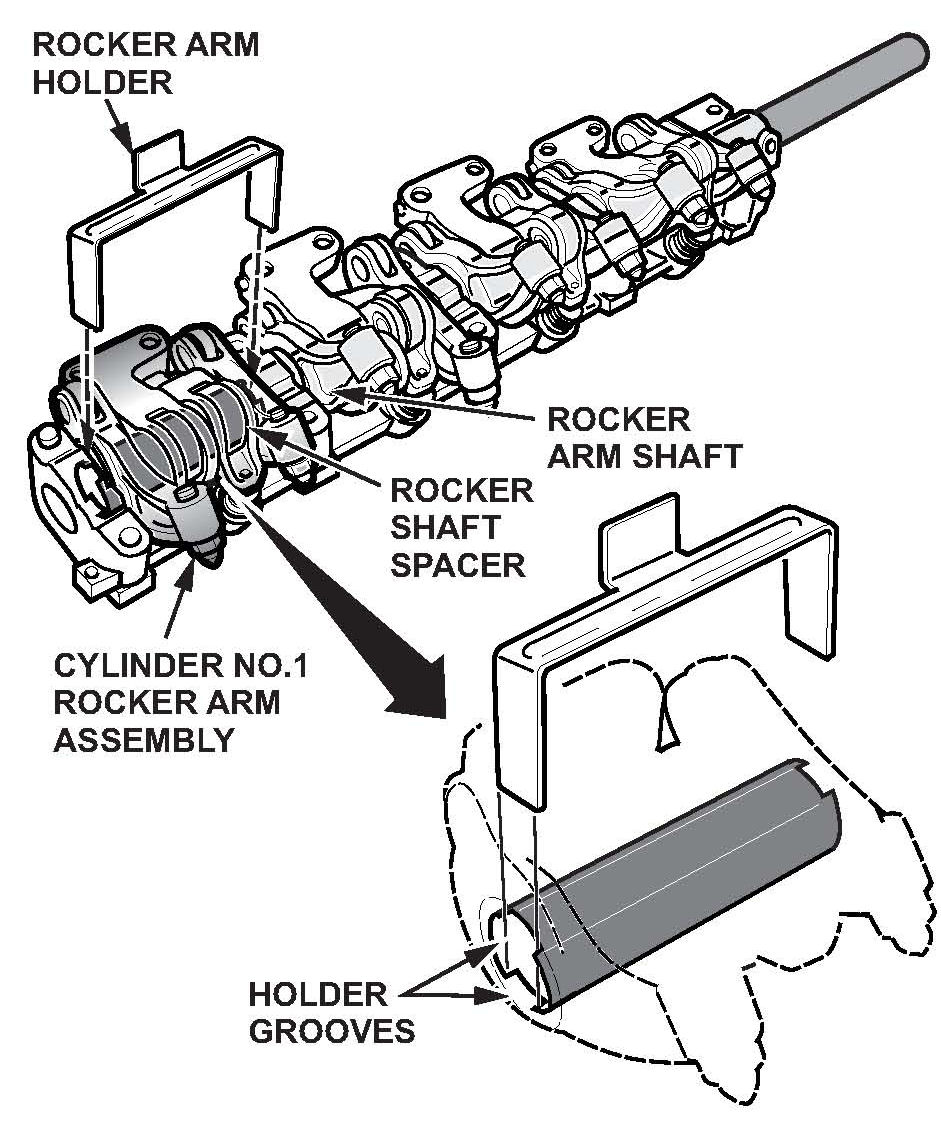 ^ While pushing in the rocker arm spacer, slide the rocker arm shaft out of the cylinder No.1 rocker arm assembly. Make sure to keep the holder grooves vertical.