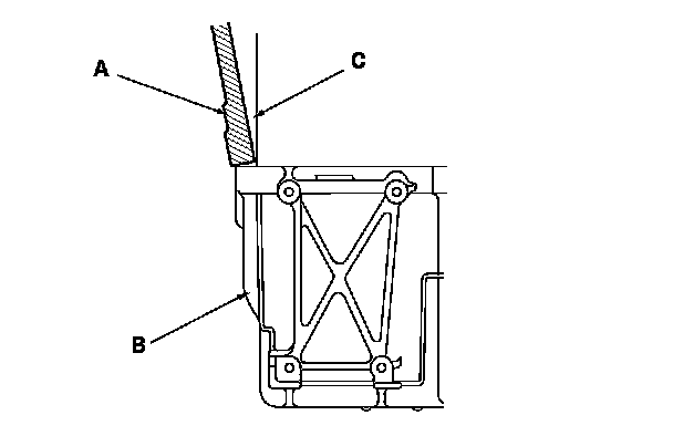 15. Set the edge of the chain case (A) to the edge of the oil pan (B), then install the chain case on the engine block (C).