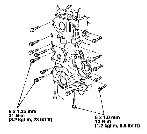 16. Tighten the chain case mounting bolts. Wipe off the excess liquid gasket on the oil pan and the chain case mating area.