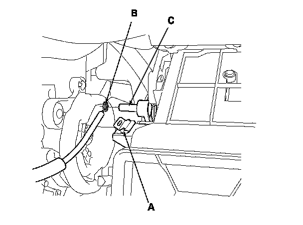 3. Detach the recirculation control cable housing from the clamp (A), and disconnect the inner cable (B) from the recirculation control linkage (C).
