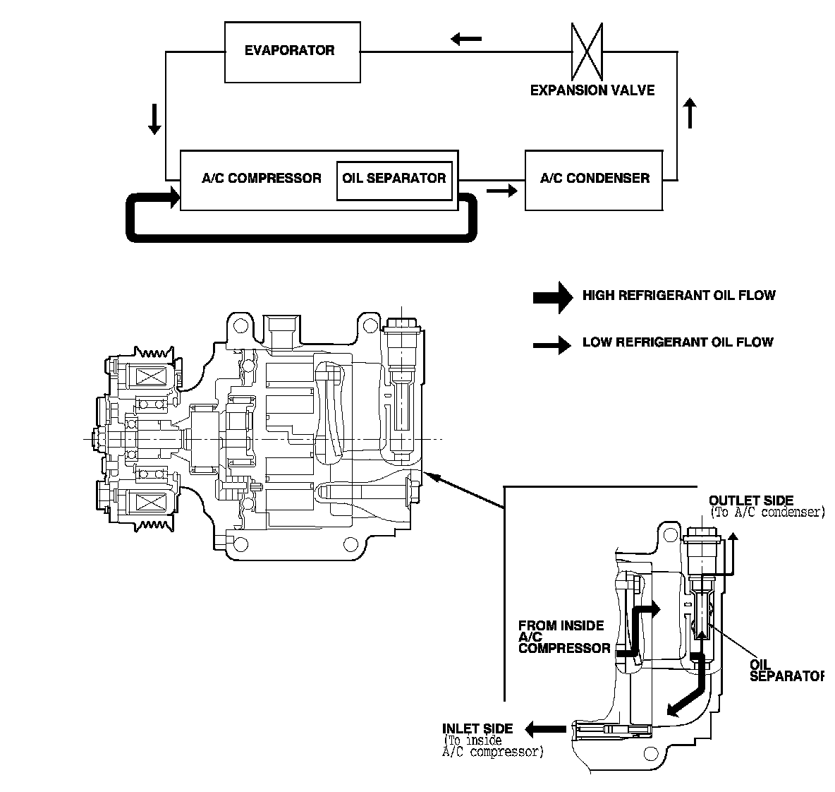 Oil emission from the A/C compressor to the A/C line is reduced by placing the oil separator in the A/C compressor. This results in a thinner oil film inside of the heat exchangers (A/C condenser and evaporator). Air conditioning efficiency is increased without sacrificing engine performance.