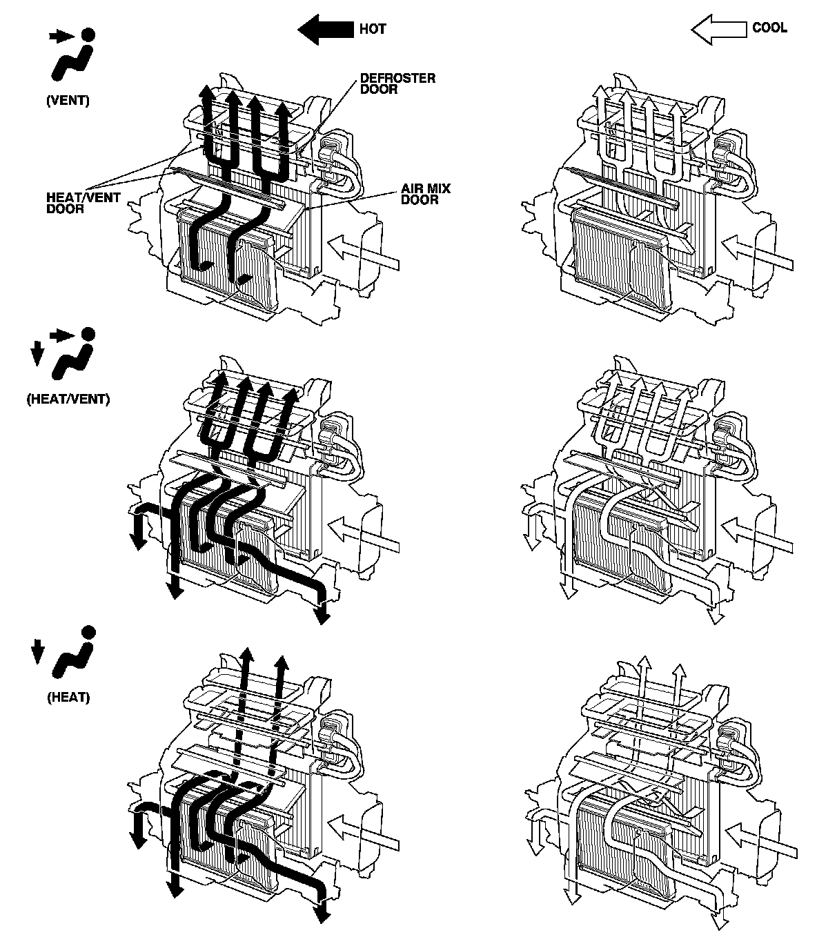 The A/C system removes heat from the passenger compartment by transferring heat from the ambient air to the evaporator. The A/C refrigerant expands in the evaporator, and the evaporator becomes very cold and absorbs the heat from the ambient air. The blower fan pushes air across the evaporator where the heat is absorbed, and then it blows the cool air into the passenger compartment.