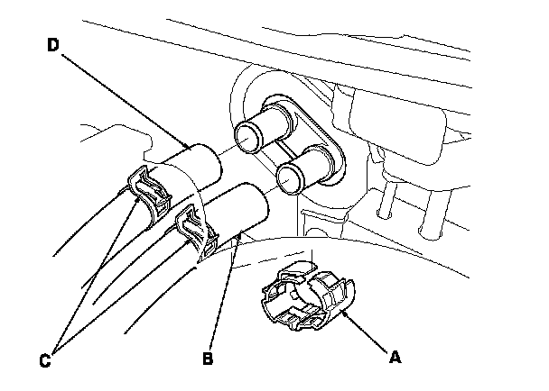4. Remove the clip (A) from the inlet heater hose (B), and discard it. The clip is for factory assembly use only. Slide the hose clamps (C) back, then disconnect the inlet heater hose and the outlet heater hose (D) from the heater unit. Engine coolant will run out when the hoses are disconnected; drain it into a clean drip pan. Be sure not to let coolant spill on the electrical parts or the painted surfaces. If any coolant spills, rinse it off immediately.