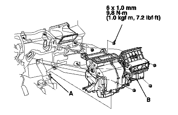 7. Disconnect the connector (A) from the evaporator sensor, and remove the blower resistor wire harness (B).