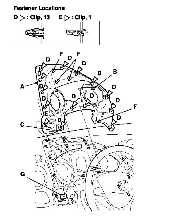 -2 Insert a flat-tip screwdriver wrapped with protective tape into the gap (C) between the instrument panel and the dashboard. Pry up on the panel to release the clips (D, E) and the hooks (F), then lift the panel away to remove it.
