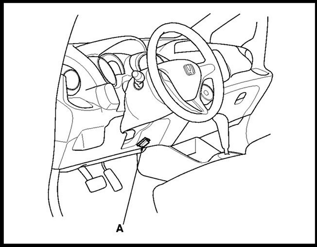 1. With the ignition switch in LOCK (0), connect the HDS to the data link connector (DLC) (A) located under the driver's side of the dashboard.