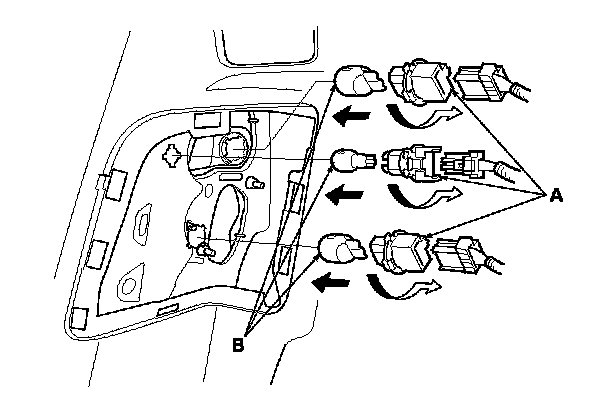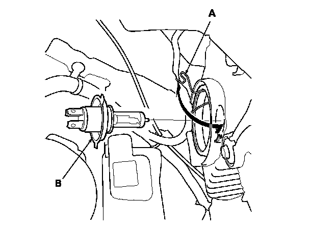 2. Pull the retaining spring (A) away from the bulb (B), then remove the bulb.