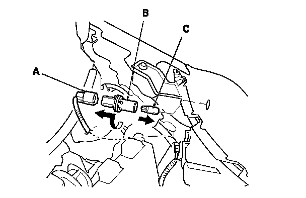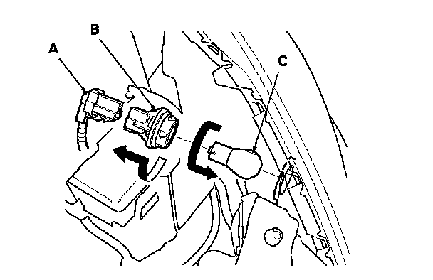 2. Turn the bulb socket (B) 45 ° counterclockwise to remove the bulb (C) from the headlight housing.