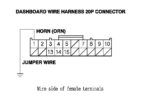 3. Using a jumper wire, connect the dashboard wire harness 20P connector terminal No. 1 to body ground. The horn should sound.