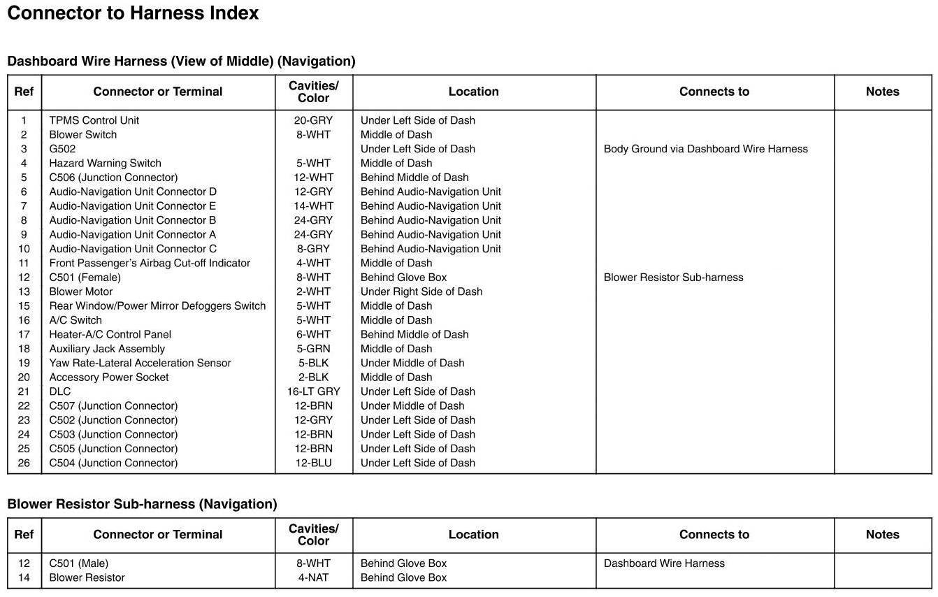 Dashboard Wire Harness (View Of Middle) And Blower Resistor Sub-Harness Connector And Harness Locations (Navigation)