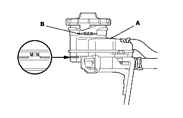 1. Make sure the brake fluid level in the reservoir (A) is at the MAX (upper) level line (B).