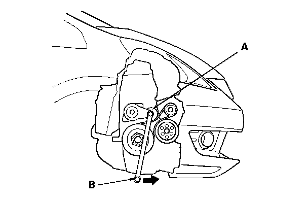 2. Move the tensioner (A) with a wrench (B) in the direction shown to relieve tension from the drive belt, then remove the drive belt.