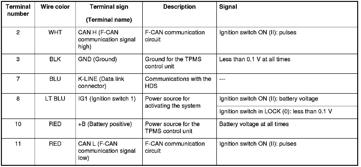 TPMS Control Unit Inputs and Outputs for 20P Connector