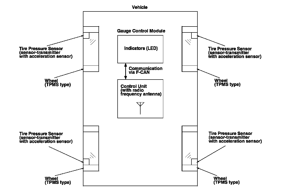 - When the vehicle is traveling more than 28 mph (45 km/h), an RF (radio frequency) band wave signal is transmitted from each tire pressure sensor to the control unit.