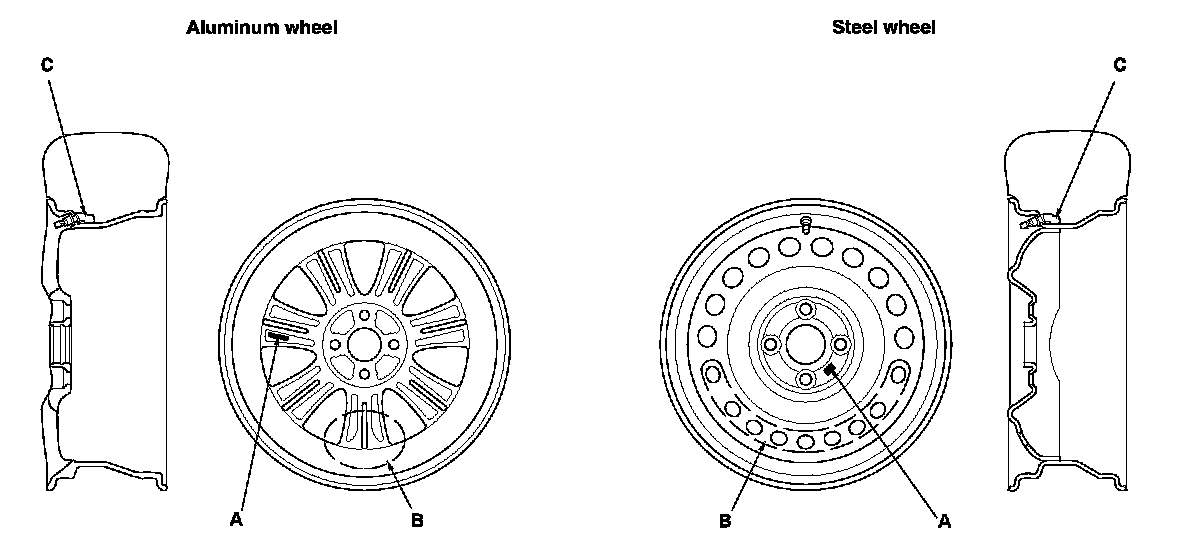 - Steel wheel type: The original equipment wheels have a "TPMS" mark (A) on them, and a counterweight (B) balances the weight of the tire pressure sensor (C) by a size difference in the wheel disc holes.