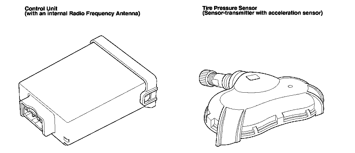 Each sensor is an integrated unit made up of the tire valve stem, a pressure sensor, and a transmitter. The unit is attached to the inside of the wheel, around the valve stem. The sensor transmits the internal tire information to the control unit once every 60 seconds when the vehicle speed exceeds 28 mph (45 km/h). When the TPMS control unit receives a tire pressure signal that is less than 175 kPa (1.8 kgf/cm2, 25 psi) with 15 inch wheels, or 183 kPa (1.9 kgf/cm2, 27 psi) with 16 inch wheels, the TPMS control unit then turns on the low tire pressure indicator. When that tire's pressure is increased to more than 200 kPa (2.0 kgf/cm2, 29 psi) with 15 inch wheels, or 210 kPa (2.1 kgf/cm2, 30 psi) with 16 inch wheels, and the vehicle is driven above 28 mph (45 km/h) the transmitter sends the tire pressure signal to the control unit, and then the control unit turns the indicator off.