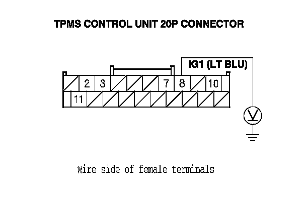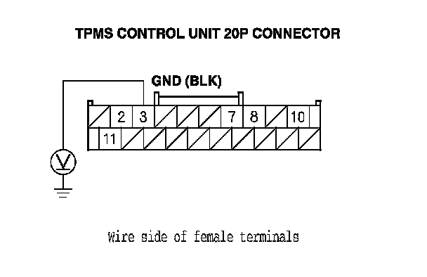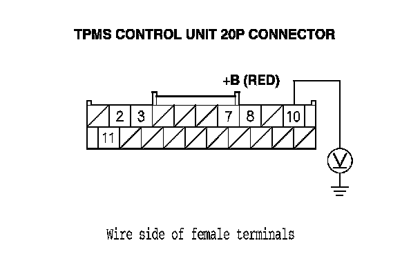 7. Measure the voltage between body ground and TPMS control unit 20P connector terminal No. 10.