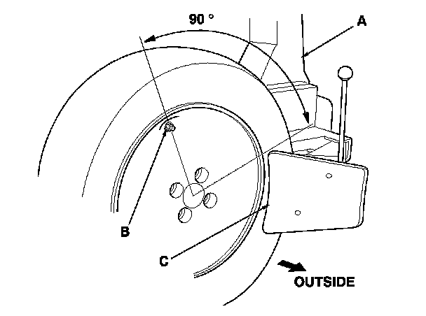 - Position the wheel as shown so the valve stem (B) is 90 degrees from the bead breaker (C) as shown.