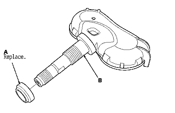 7. Remove and discard the valve stem grommet (A) from the tire pressure sensor (B).