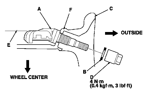 NOTE: Install the tire pressure sensor so that the sensor housing surface (E) does not extend beyond the protrusion (F) on the wheel to prevent the sensor housing from being caught on the bead of the tire when assembling the tire.