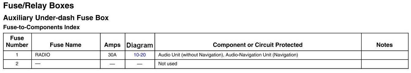 Auxiliary Under-Dash Fuse Box - Fuse-To-Components Index