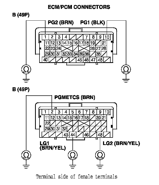 75. Check for continuity between body ground and ECM/PCM connector terminals B1, B10, C2, C44, and C48 individually.