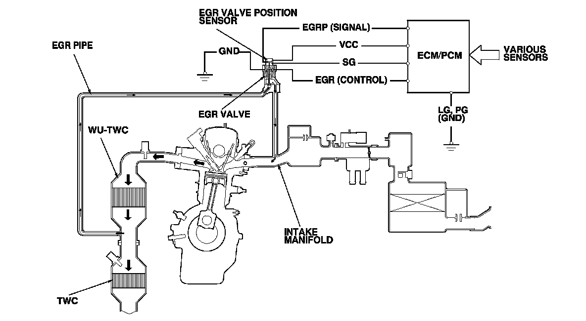 The EGR system reduces oxides of nitrogen (NOx) emissions by recirculating exhaust gas through the EGR pipe and the intake manifold, and into the combustion chambers. Routing the exhaust gas through the EGR pipe helps to prevent carbon deposits from forming in the intake manifold and the throttle body. The ECM/PCM memory includes the ideal EGR valve position for varying operating conditions.