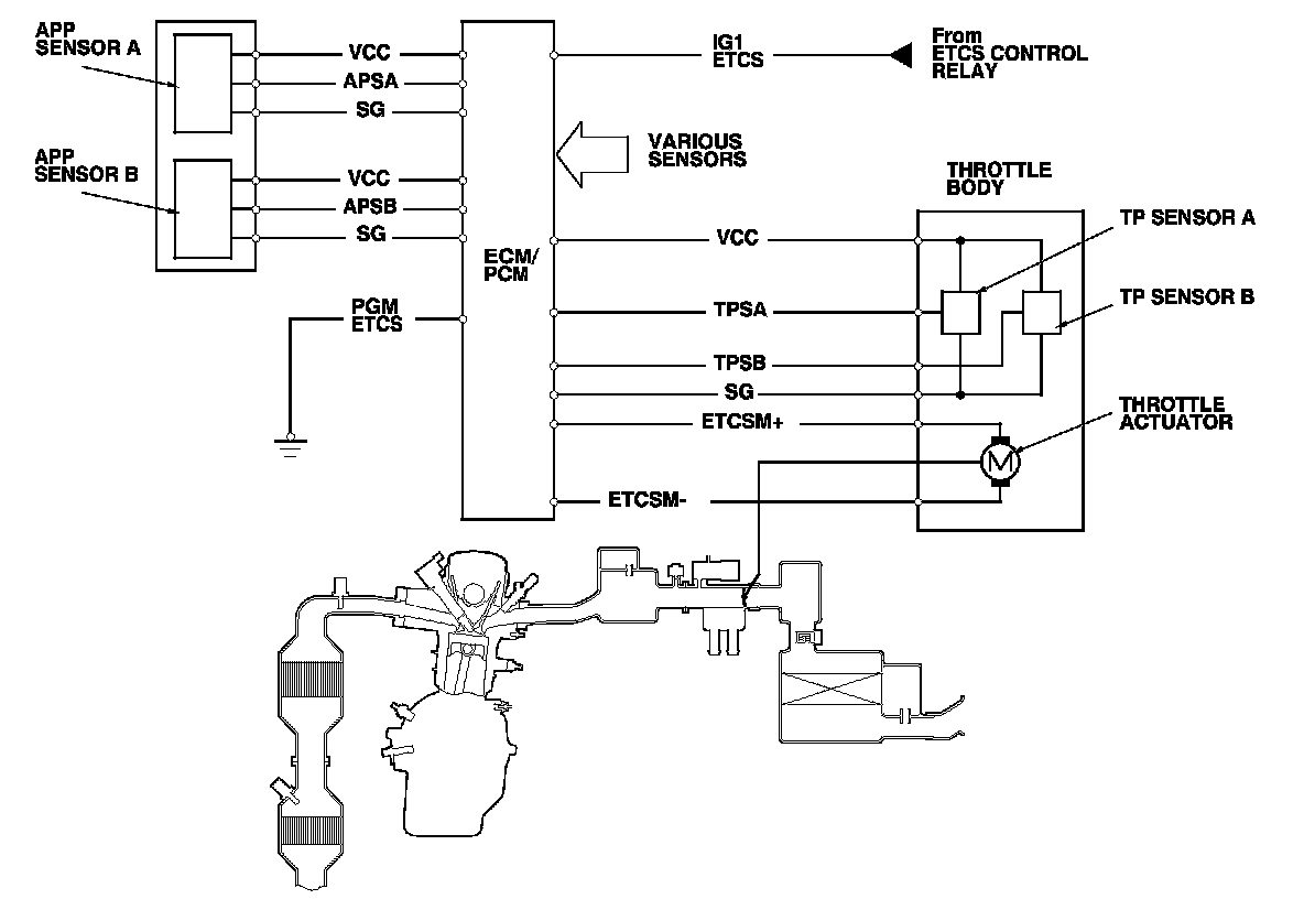 The electronic throttle control system consists of the throttle actuator, throttle position (TP) sensor A/B, accelerator pedal position (APP) sensor A/B, the electronic throttle control system (ETCS) control relay, and the ECM/PCM.