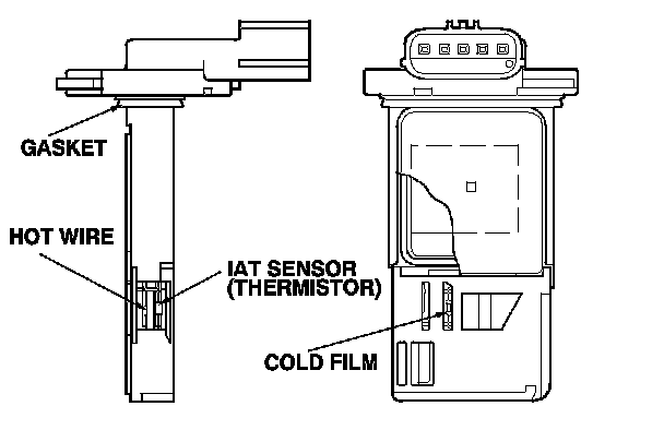 The mass air flow (MAF) sensor/intake air temperature (IAT) sensor contains a hot wire, cold film and a thermistor. The sensor is in the intake air passage. The resistance of the hot wire, the cold film and the thermistor changes due to intake air temperature and air flow. The control circuit in the MAF sensor controls the current to keep the hot wire at a set temperature. The current is converted to voltage in the control circuit, then output to the ECM/PCM.