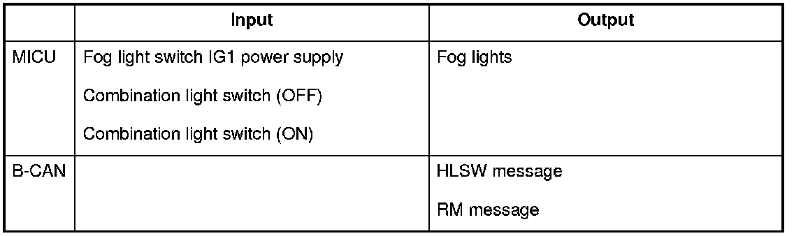 The MICU control of the fog lights is based on input signal from the fog light switch.