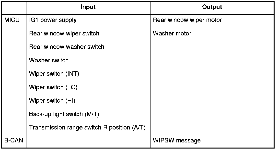 The MICU control of the rear window wiper motor and washer motor is based on input signals from each switch.