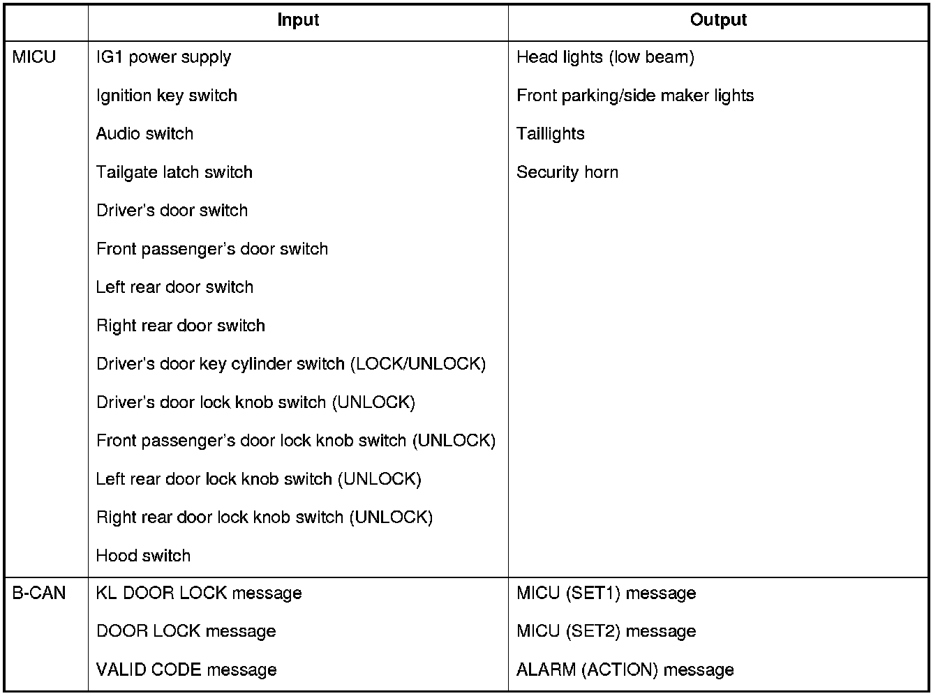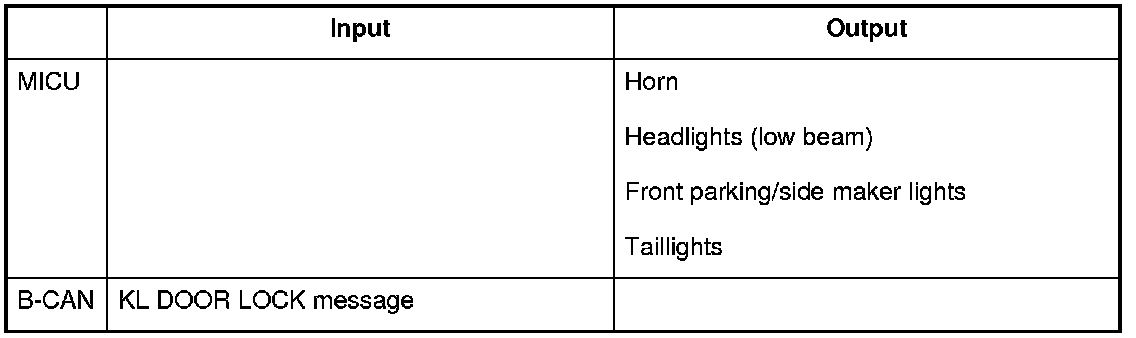 The MICU control of the lighting system and the security horn is based on input signals of each switch and B-CAN signals.