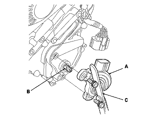 6. Align the cutouts (A) on the rotary-frame with the neutral positioning cutouts (B) on the transmission range switch (C), then put a 2.0 mm (0.08 in.) feeler gauge blade (D) in the cutouts to hold the switch in the N position.