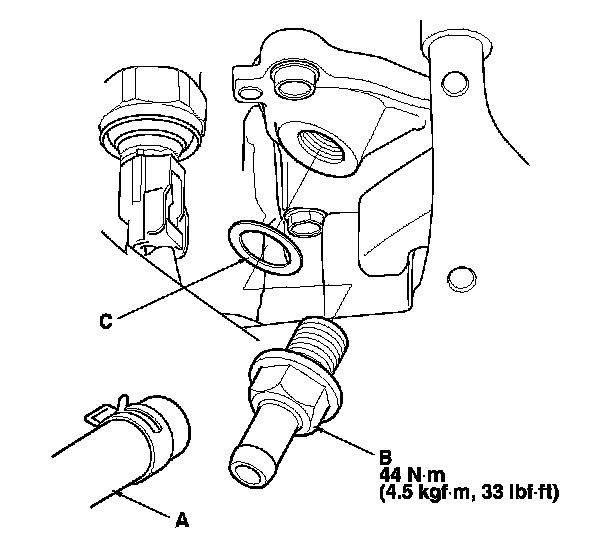 4. Install the parts in the reverse order of removal with a new 14 mm washer (C).