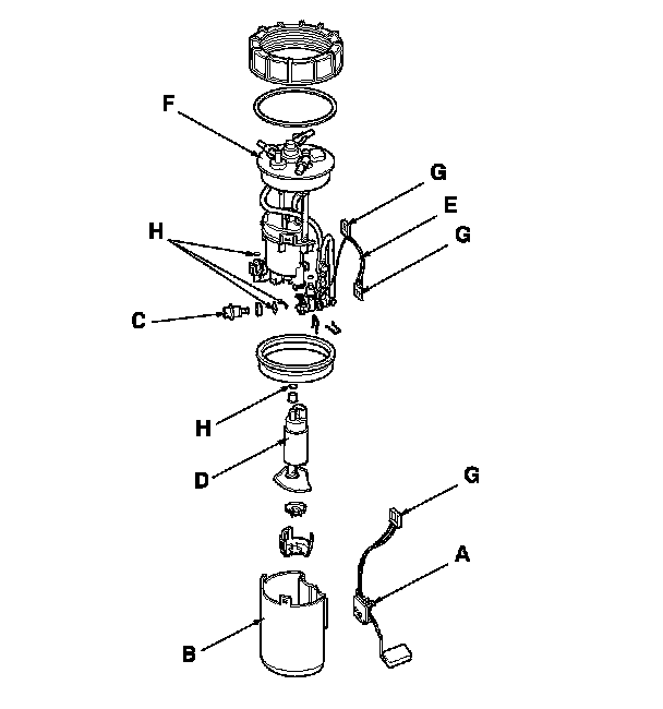 3. Remove the fuel pressure regulator (C), the fuel pump (D), and the wire harness (E) from the fuel filter set (F).