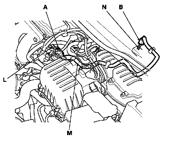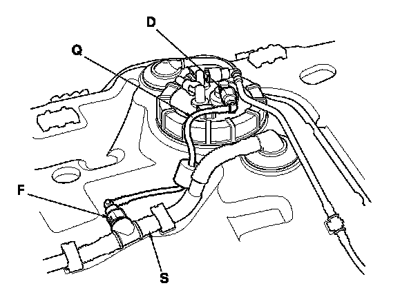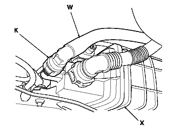 The fuel line/quick-connect fittings (A), (B), (C), (D), (E), (F), (G), (H), (I), (J), (K) connect the fuel rail (L) to fuel feed hose (M), the fuel feed hose to the fuel line (N), the fuel feed line (O) to the fuel tank unit (P), the fuel tank unit to the fuel vent tube (Q), the fuel tank unit to the suction line (R), the fuel vent tube to the fuel tank vapor control valve hose (S), the suction tube to the fuel tank vapor recirculation tube (T), the suction tube to the breather pipe (U), the breather pipe to the non-return valve tube (V), and the fuel purge pipe (W) to the EVAP canister (X). When removing or installing the fuel feed hose, the fuel tank unit, the fuel tank, or the suction tube, or when disconnecting/connecting the quick-connect fittings, pay attention to the following: