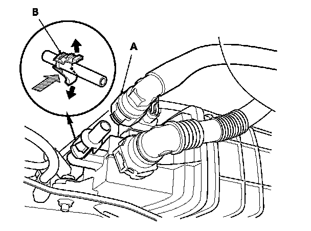 3. Before connecting a new fuel tube/quick-connect fitting assembly (A), remove the old retainer (B) from the mating line.