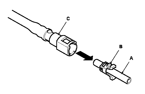 5. When you are reconnecting the connector with the old retainer, make sure the connection is secure and the tabs (A) are firmly locked into place; check visually and also by pulling the connector (B). When you are replacing the fuel line with a new one, make sure you remove the ring pull (C) upwards after you confirm the connection is secure.