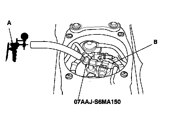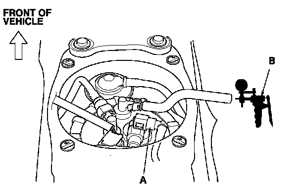 3. Disconnect the suction line (A) from the fuel tank unit, and connect a vacuum pump/gauge, 0-30 in.Hg (B) to the hose as shown.