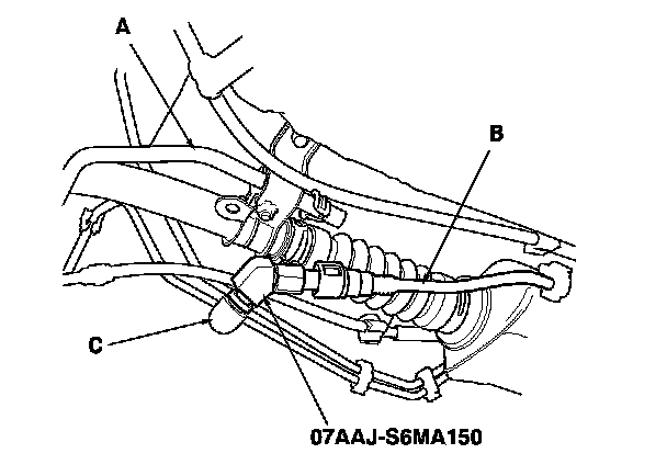 9. Disconnect the breather line (A). Attach the fuel pressure gauge attachment, then plug the suction line (B) with a rubber cap (C).