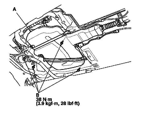 8. Remove the front floor cross beam (A), and the tank mount bracket (B).
