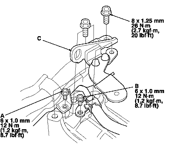 10. Remove the transmission hanger/air cleaner housing bracket (C).