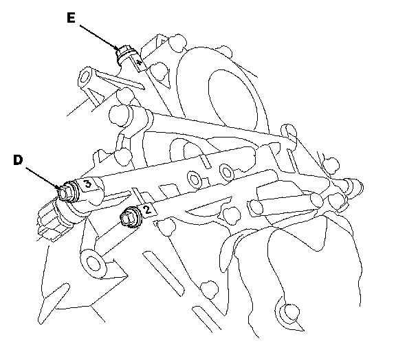 19. Connect the oil pressure gauge to the 3rd clutch pressure inspection port (D) and the 4th clutch pressure inspection port (E).