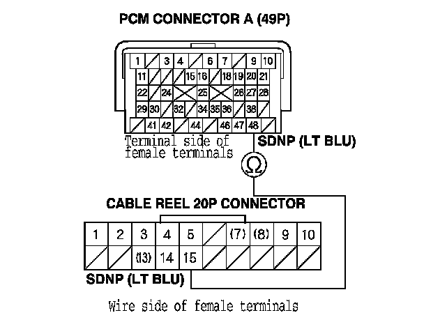 10. Check for continuity between PCM connector terminal A48 and cable reel 20P connector terminal No. 15.