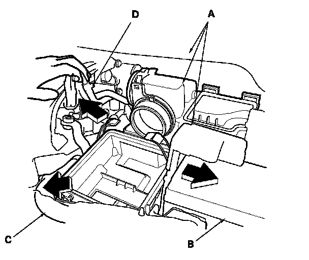 1. Disconnect the MAF sensor/IAT sensor connector(A), then remove the air cleaner cover (B) and the air cleaner element (C).