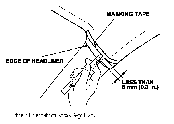 To prevent the side curtain airbag from deploying and damaging the pillar trim, the overlap between the headliner and pillar trim must be less then 8 mm (0.3 in.). To check the overlap, do this: