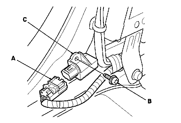 5. Remove the TORX bolt (B) using a TORX T30 bit, then remove the side impact sensor (first) (C).