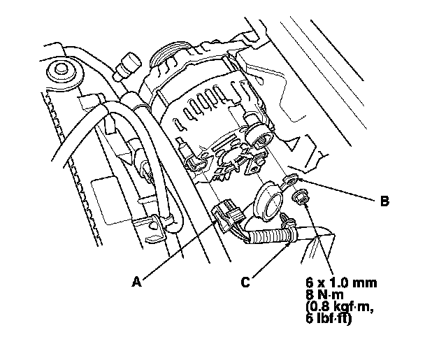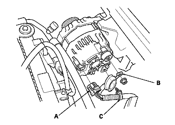 4. Disconnect the alternator connector (A) and BLK wire (B), then remove the harness clamp (C) from the alternator.